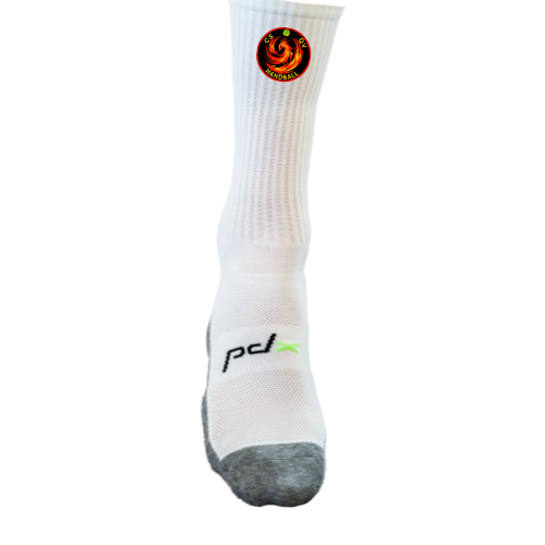 Chaussettes de sport blanches avec semelles anti-dérapantes, pour une meilleure tenue du pied lors des appuis.