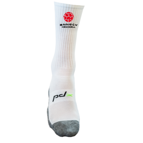Chaussettes de sport blanches avec semelles anti-dérapantes, pour une meilleure tenue du pied lors des appuis.