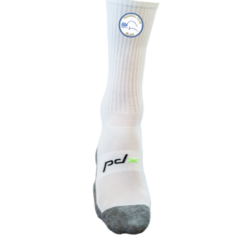 Chaussettes de sport blanches avec semelles anti-dérapantes, pour une meilleure tenue du pied lors des appuis.