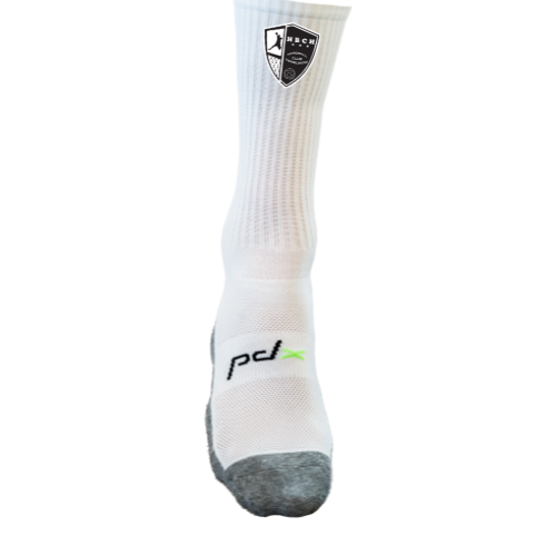 Chaussettes de sport blanches avec semelles anti-dérapantes, pour une meilleure tenue du pied lors des appuis.