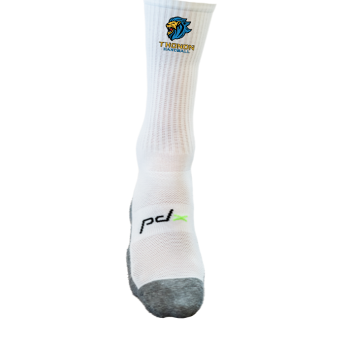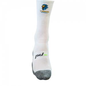 Chaussettes de sport blanches avec semelles anti-dérapantes, pour une meilleure tenue du pied lors des appuis.