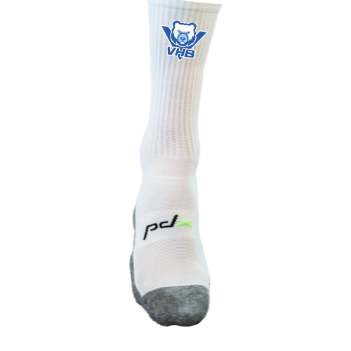 Chaussettes de sport blanches avec semelles anti-dérapantes, pour une meilleure tenue du pied lors des appuis.